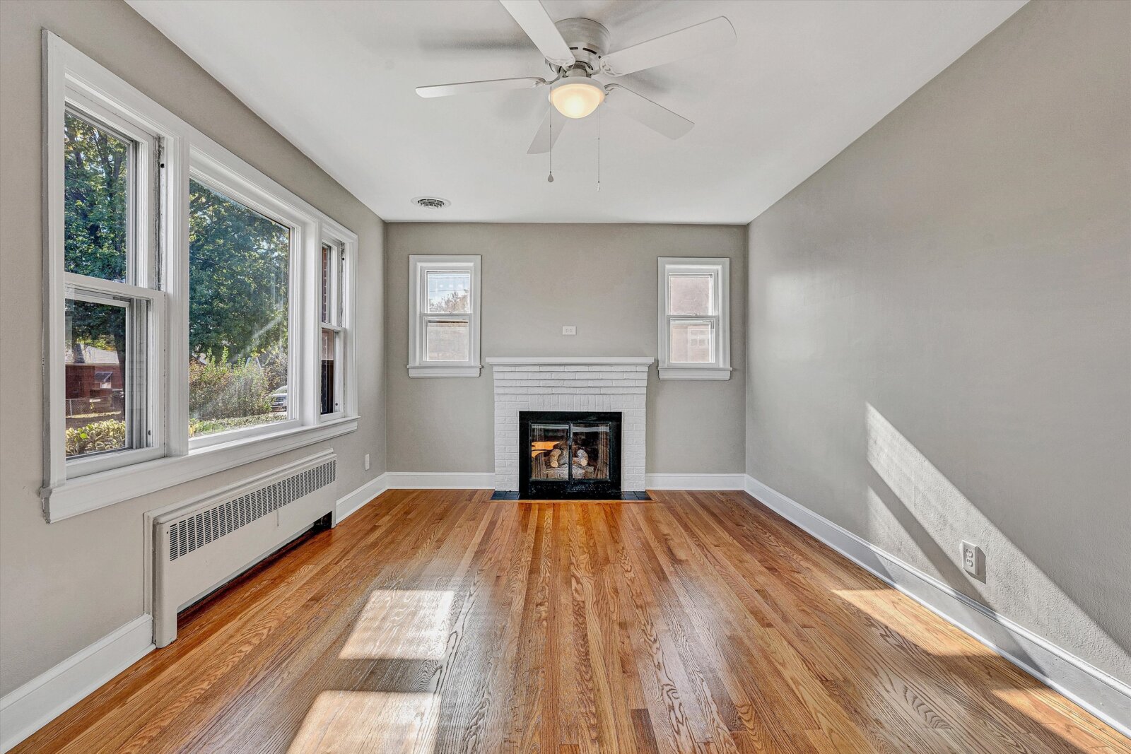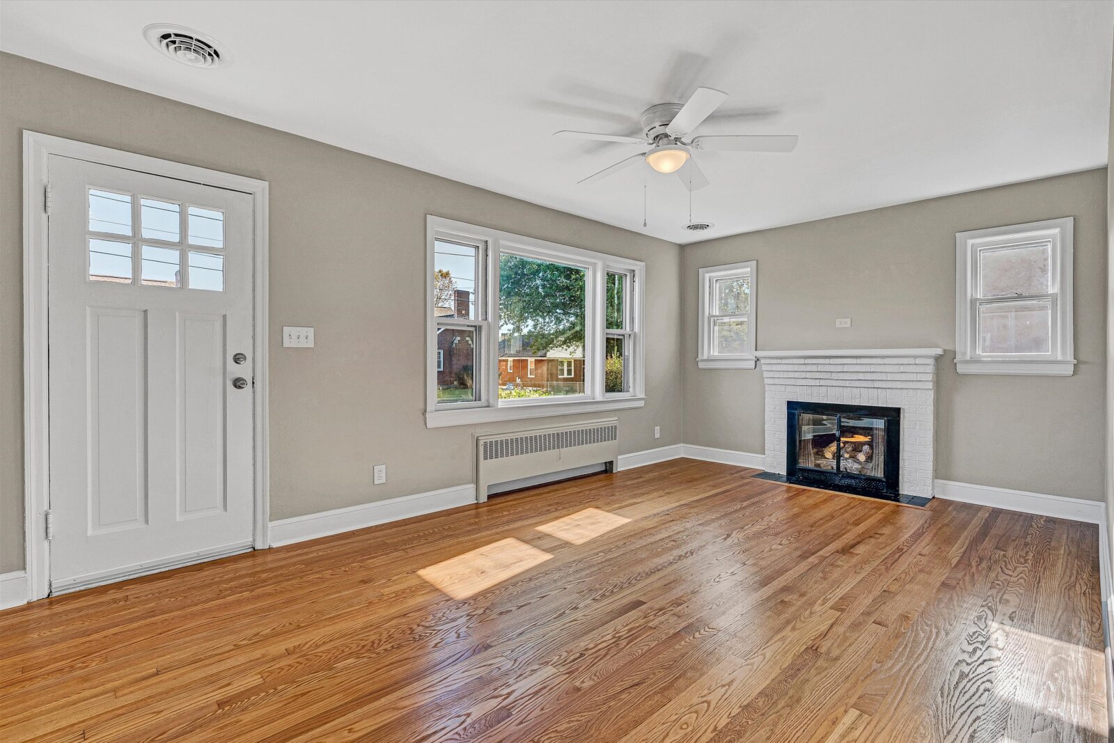 - Living room with hardwood floors, classic gas log fireplace & mantle, new light/fan